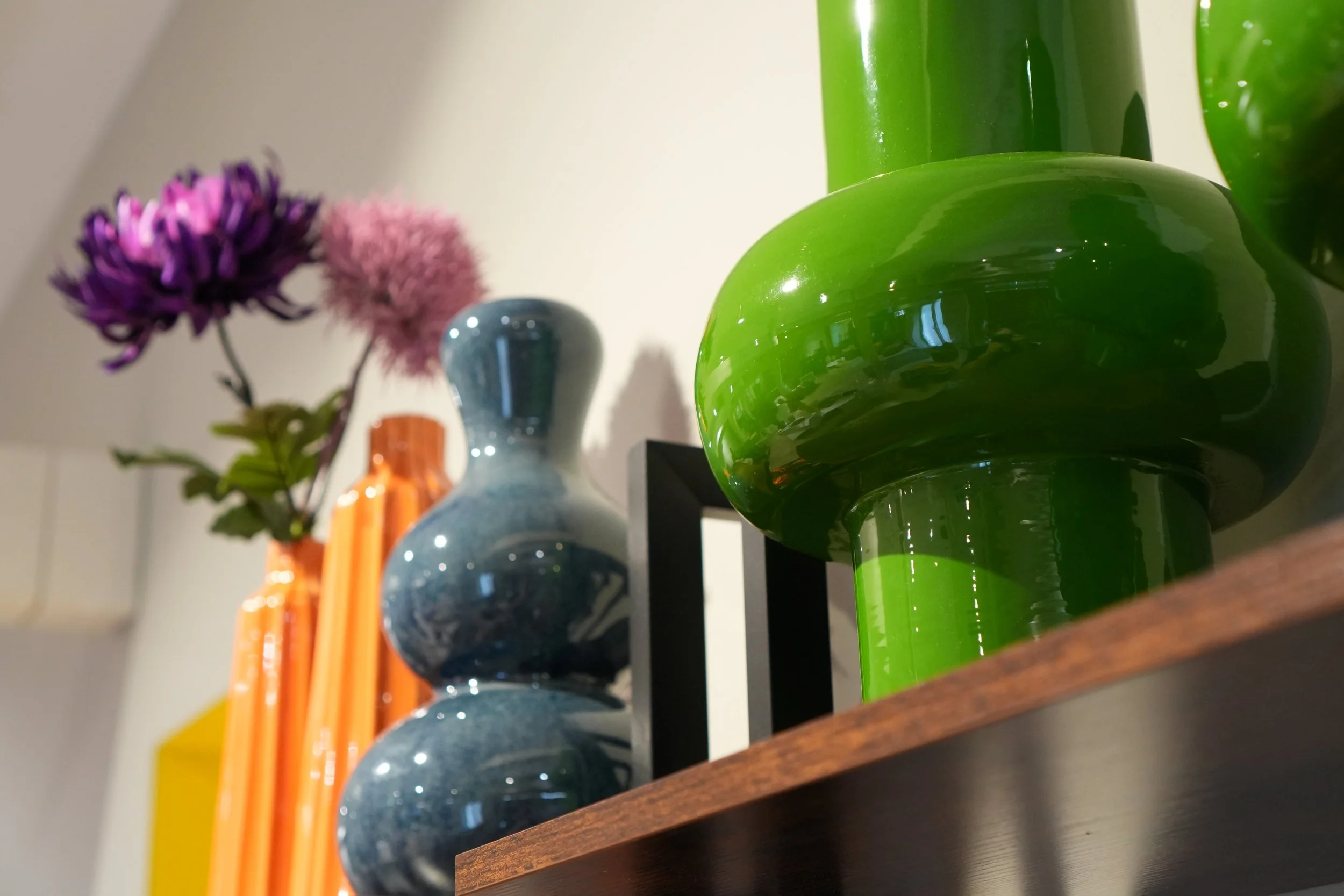 Bunte Vasen und Lampen in einem Raum, teilweise durch eine weiße Wand verdeckt.