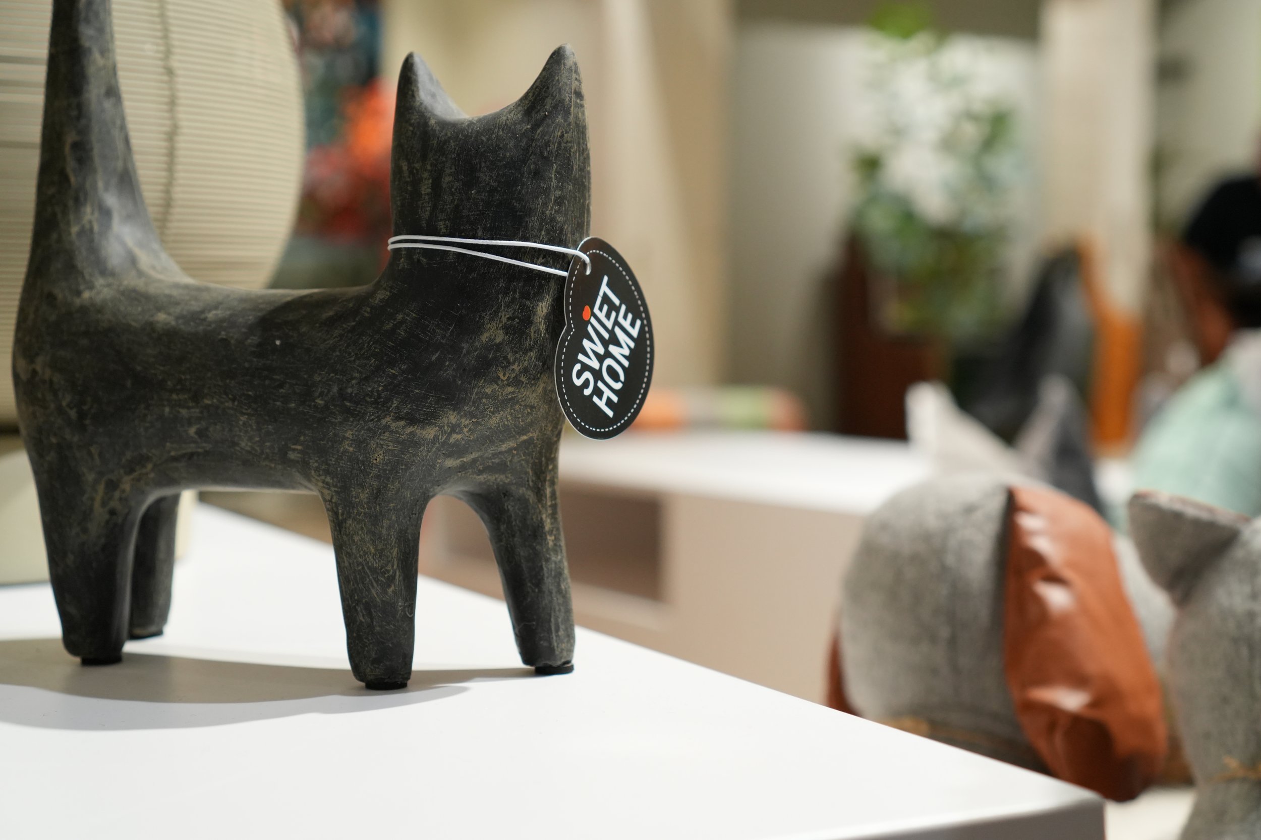 Eine schwarze, stilisierte Katze aus Keramik auf einem weißen Regal, mit einem Aufkleber, der 'Sweet Home' sagt, im Hintergrund weitere dekorative Gegenstände aus Keramik.