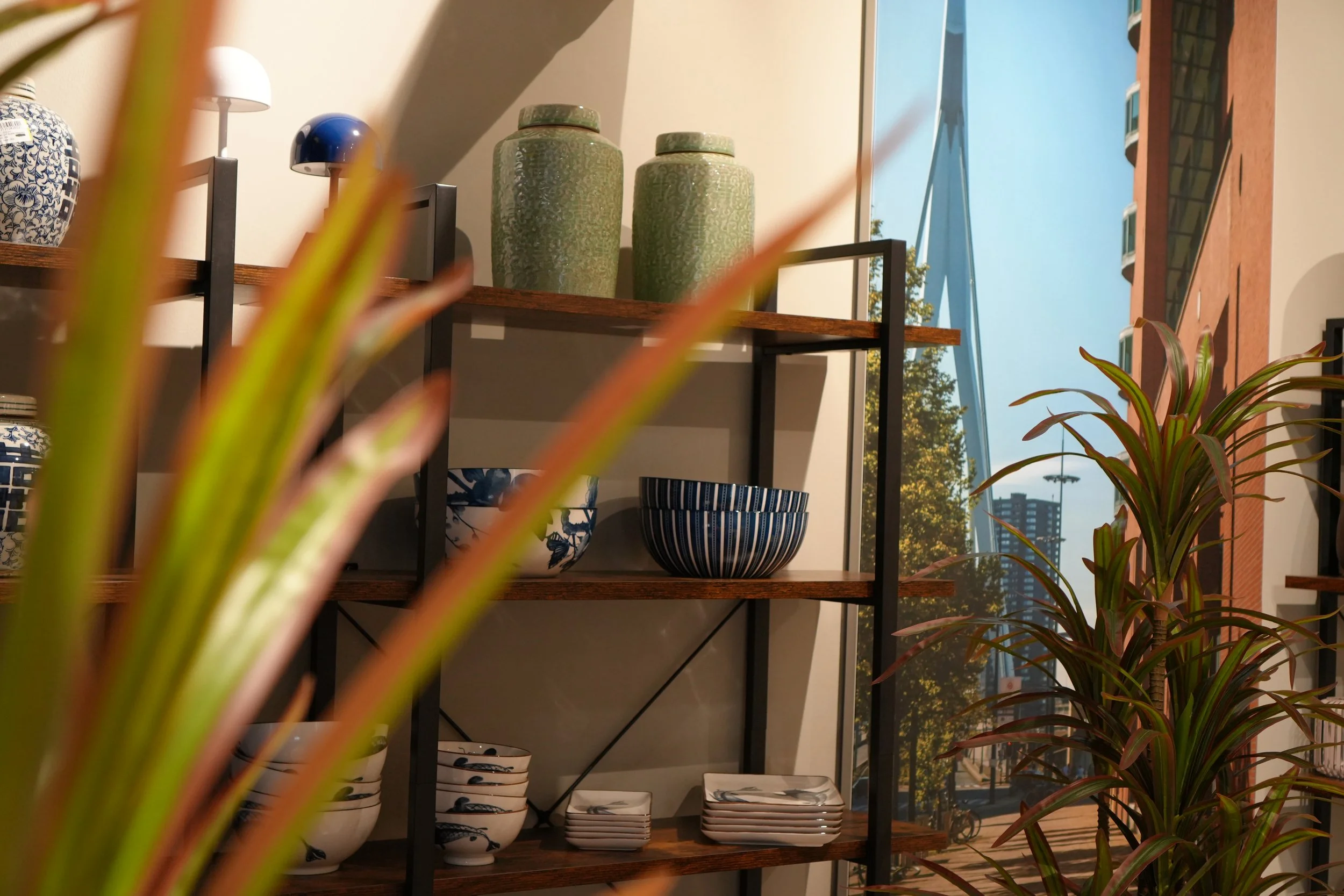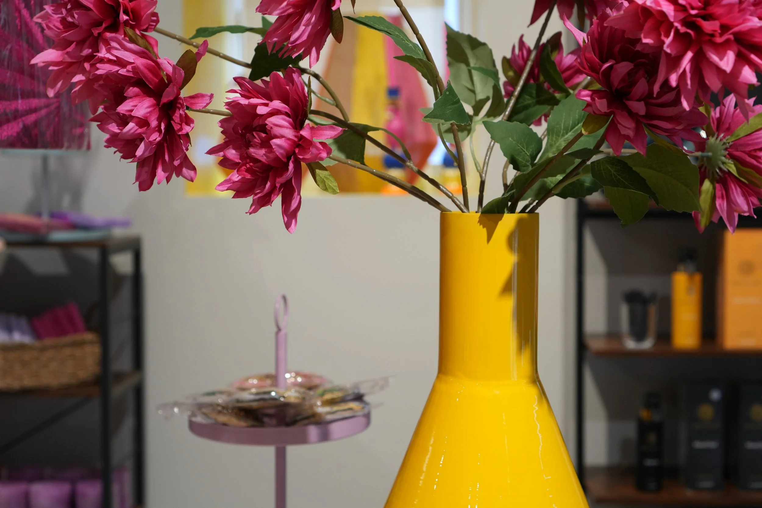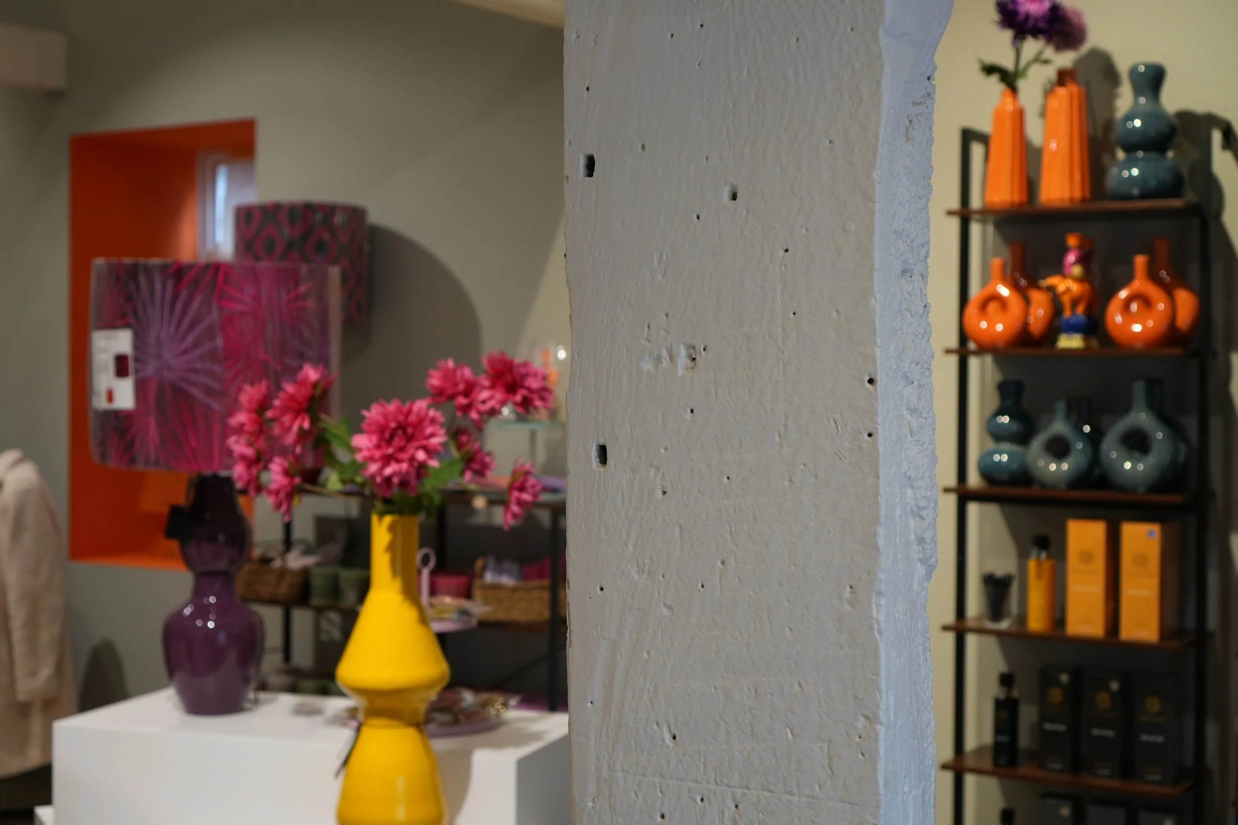 Innenraum eines stilvollen Geschäfts mit bunten dekorativen Gegenständen, Pflanzen und Sitzgelegenheiten, im Hintergrund ein Regal mit Vasen und anderen Dekorationsartikeln.