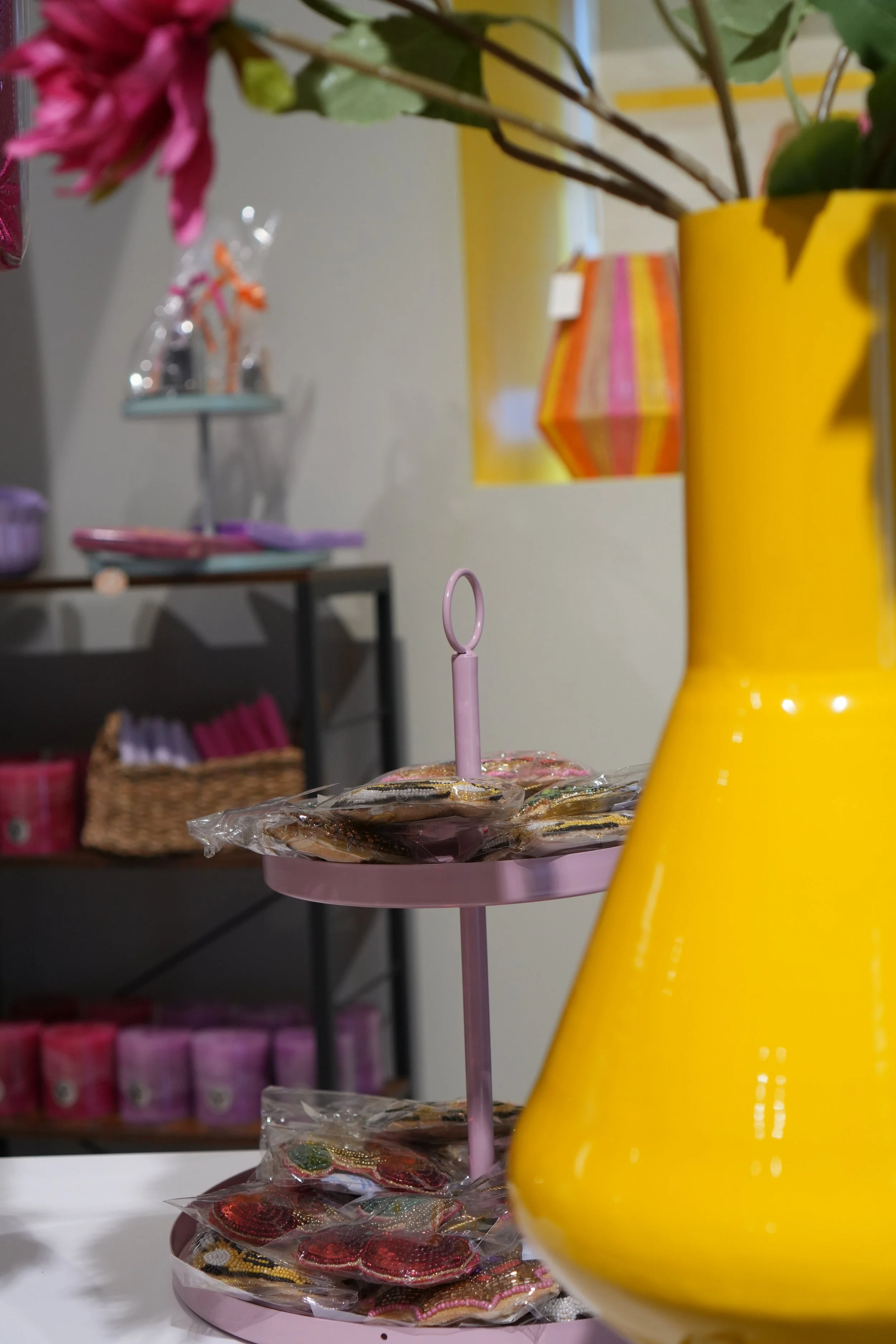 Pinkfarbener wendbarer Keksteller mit verpackten Keksen, im Hintergrund bunte Vasen und Dekorationsartikel.