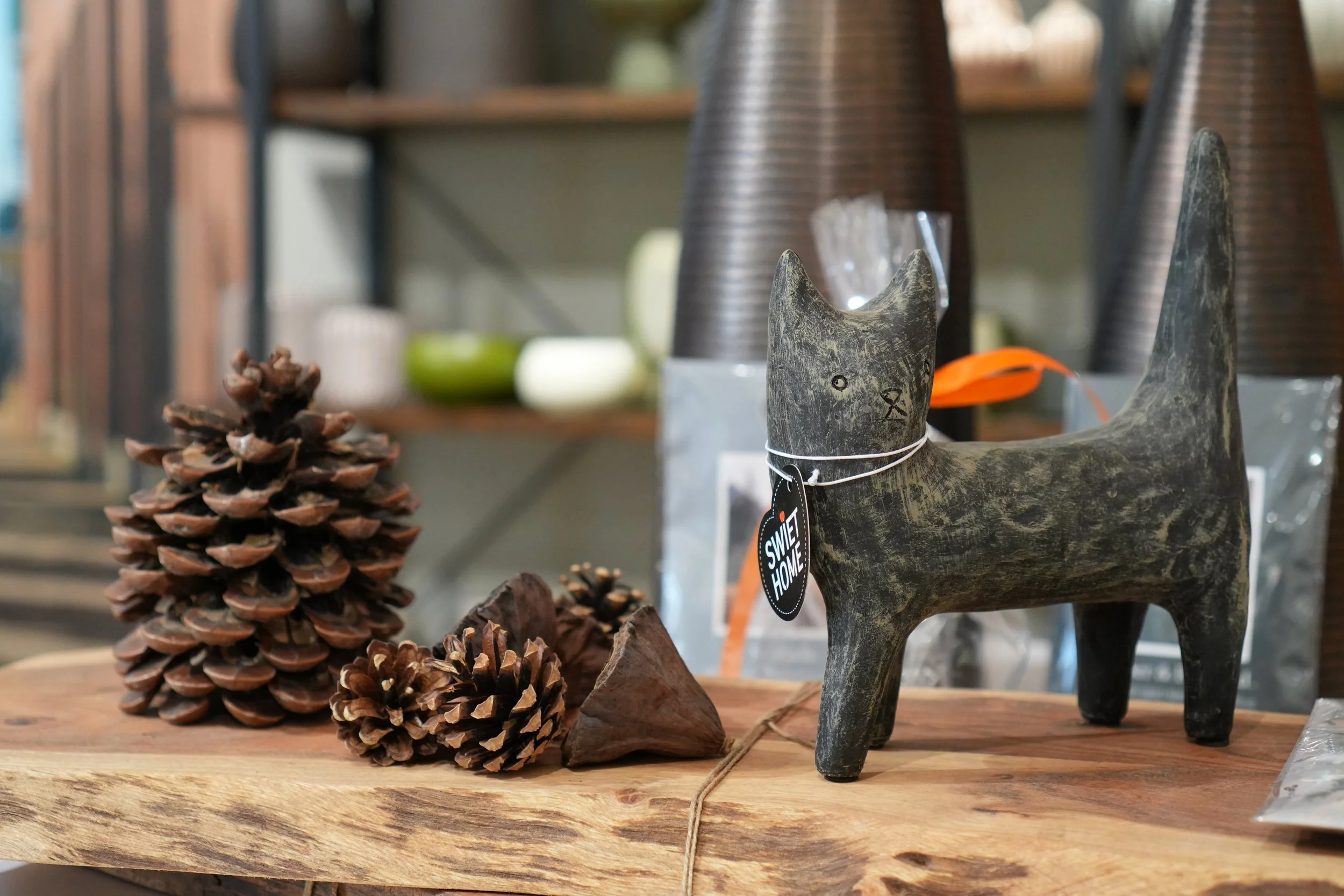 Holzfigur eines katzenähnlichen Tiers auf einem Holzbrett, umgeben von Tannenzapfen und einem Stück Holz. Hintergrund mit Geschirr und Dekorationsgegenständen.
