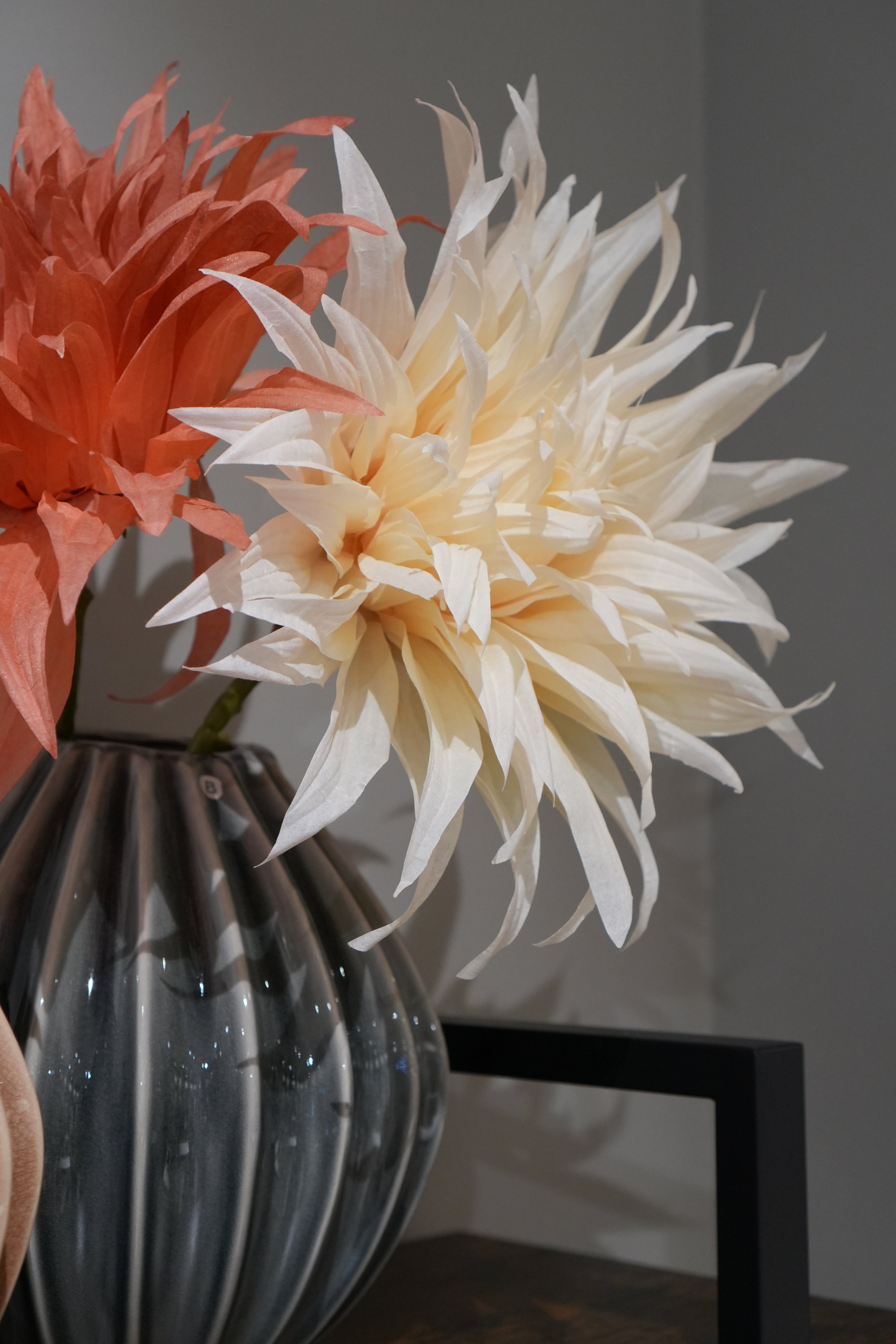 zwei große künstliche Blumen, eine rosa und eine cremefarbene, in dunklen Vasen mit vertikalen Streifen, auf einem Tisch