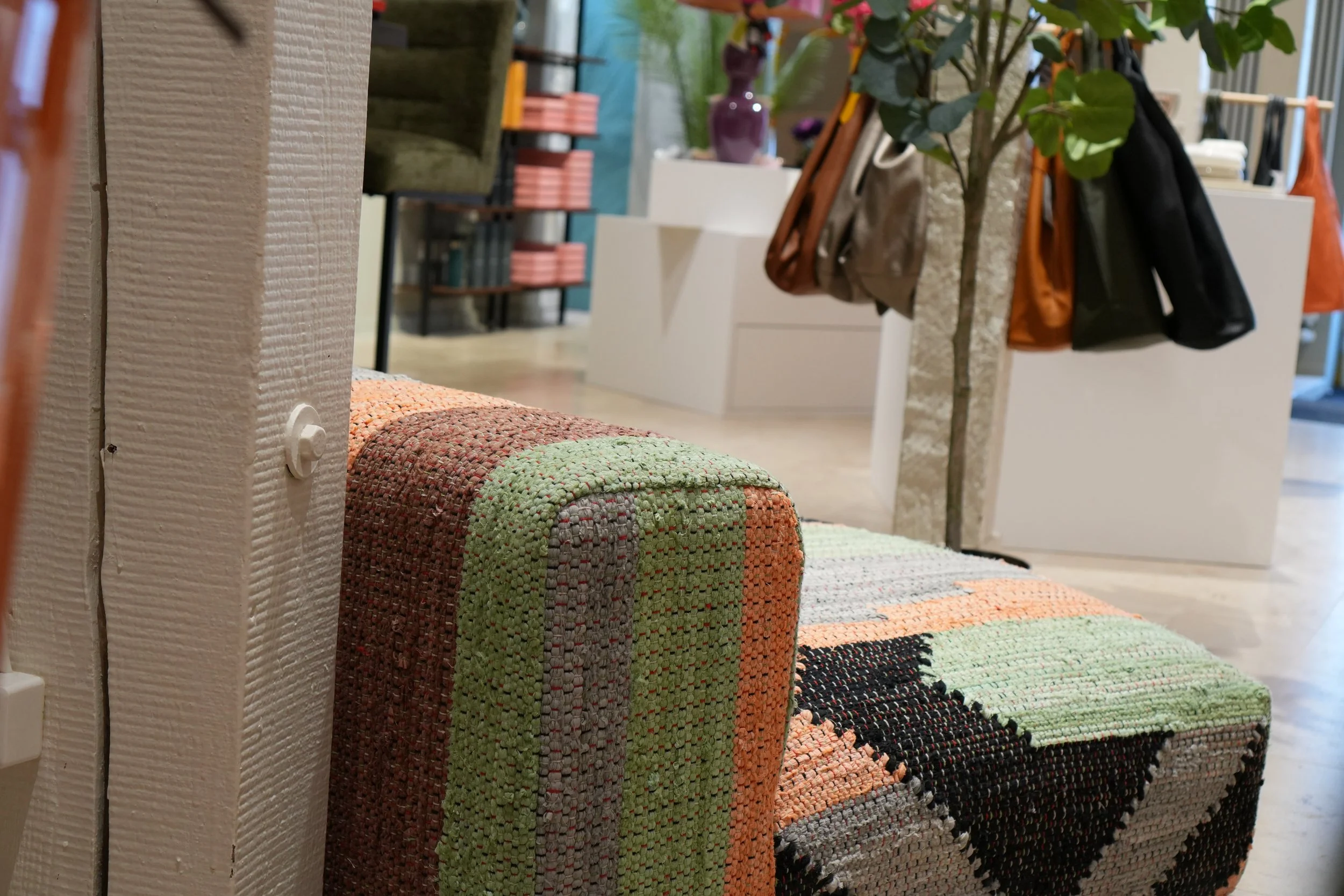 Blick auf eine bunte, gepolsterte Sitzbank in einem Einrichtungsgeschäft, mit einem weißen Holzrahmen im Vordergrund, im Hintergrund Pflanzen, Taschen und Geschirr.