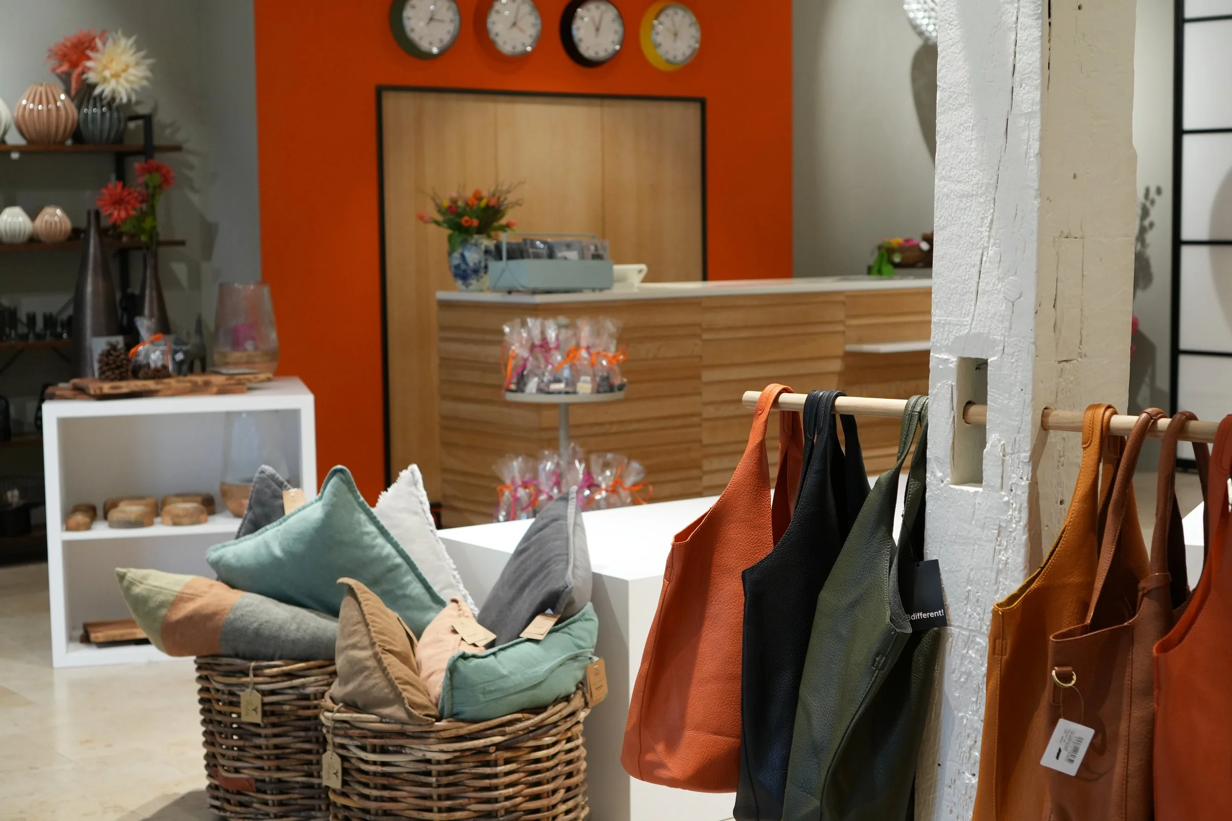Inneneinrichtung eines Ladens mit Dekorationsartikeln, Vasen, Kissen und Wanduhren an einer orange Wand.