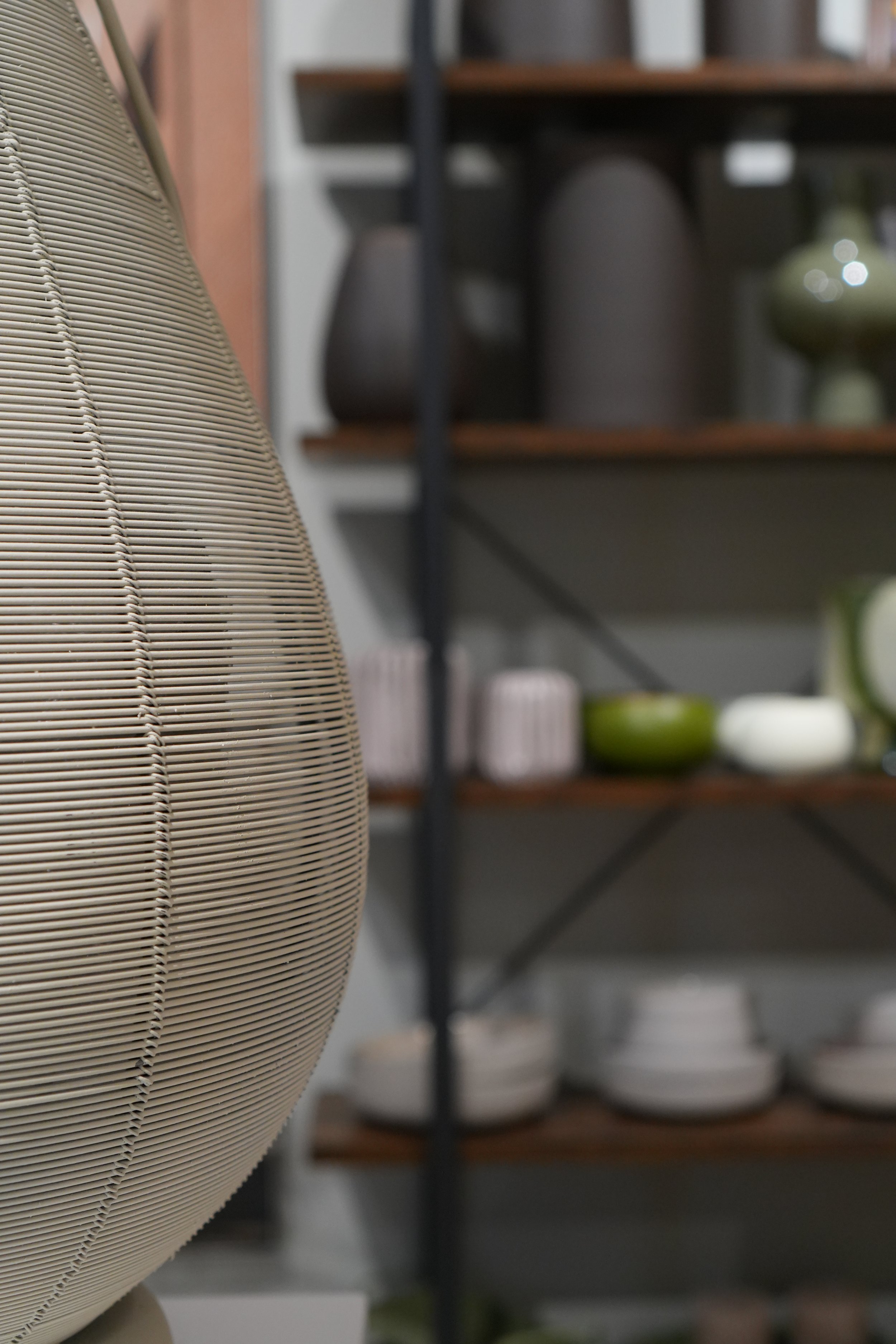 Nahaufnahme eines braunen, gerippten Lautsprechers im Vordergrund, mit einer offenen Regalwand im Hintergrund, die verschiedene Vasen und Geschirrstücke in neutralen Farben zeigt.