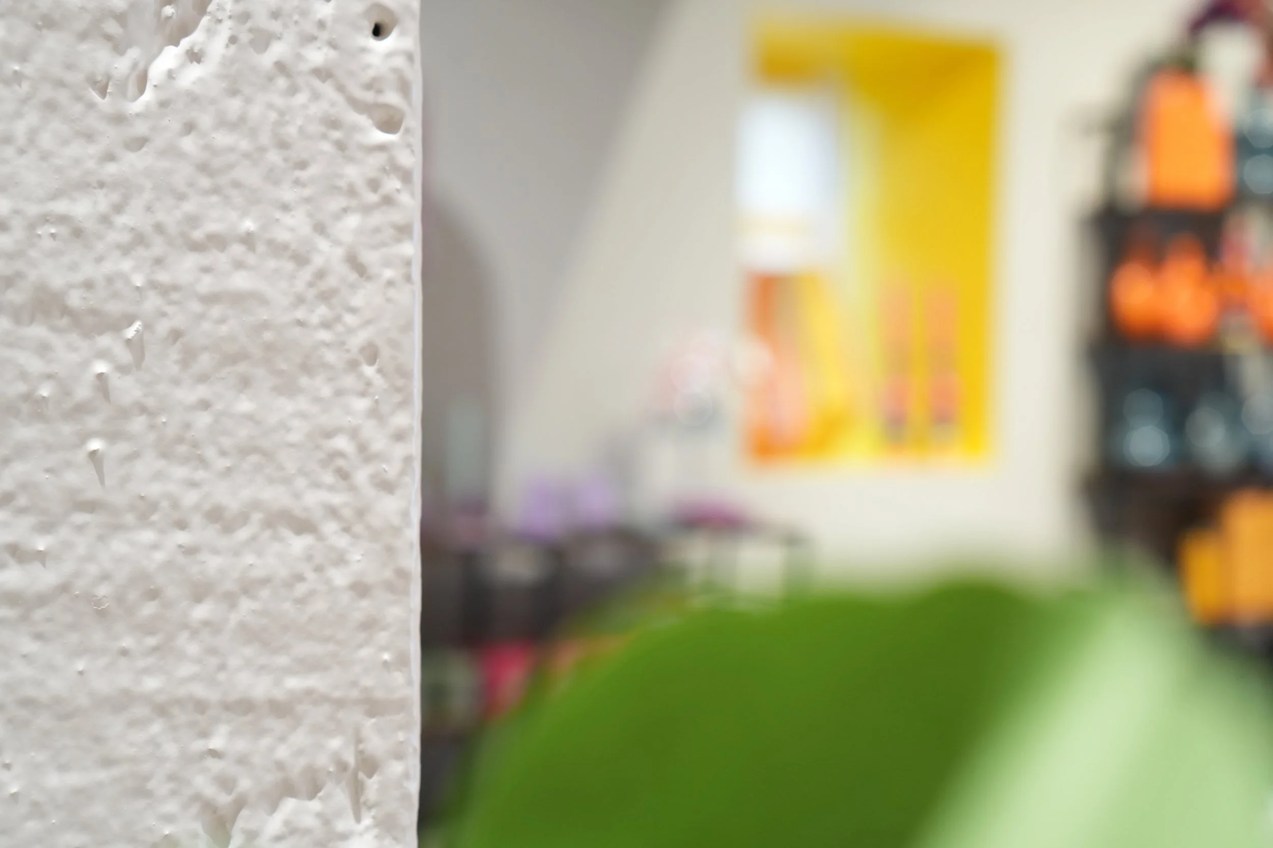 Nahaufnahme einer weißen Wand mit Wassertröpfchen, unscharfer Hintergrund mit einer gelben Tür und schwarzen Regalen