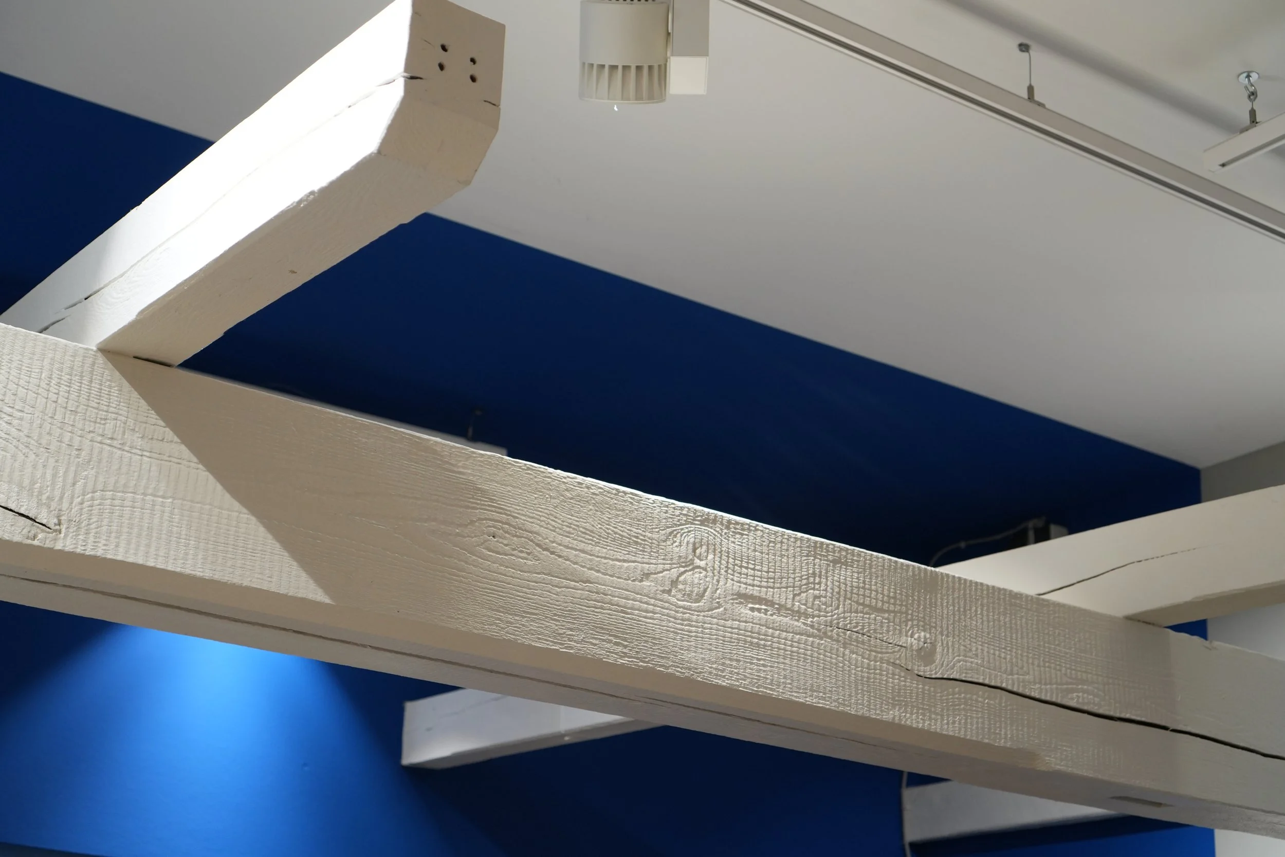 Innenraum mit weiß gestrichenen Holzbalken, blauer Wand und weißen Deckenstrukturen, sichtbare Kabel und Lüftungsschächte.