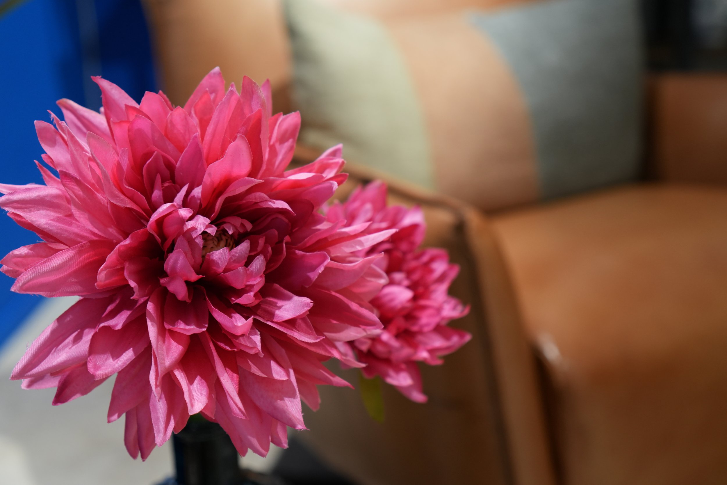 Nahaufnahme einer pinkfarbenen Blume mit mehreren Blütenblättern vor einem Möbelstück mit buntem Kissen.