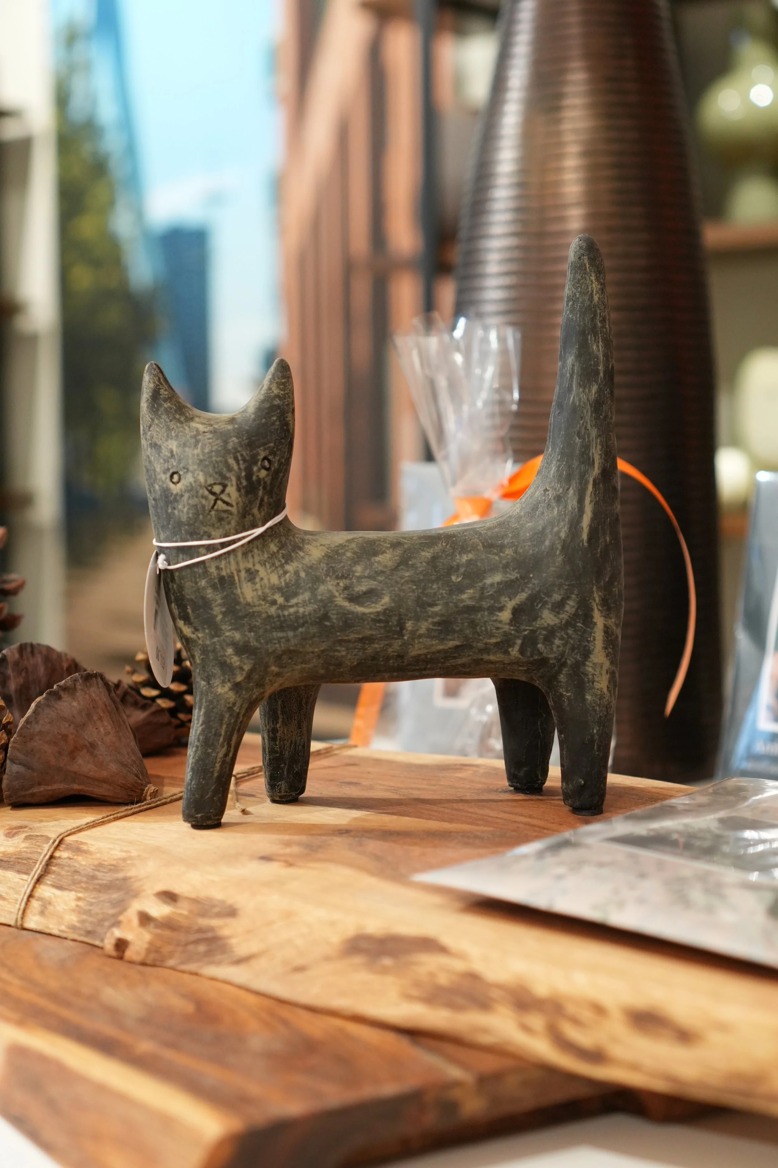 Eine schwarze, skulpturale Katze aus Holz auf einem rustikalen Holztisch.