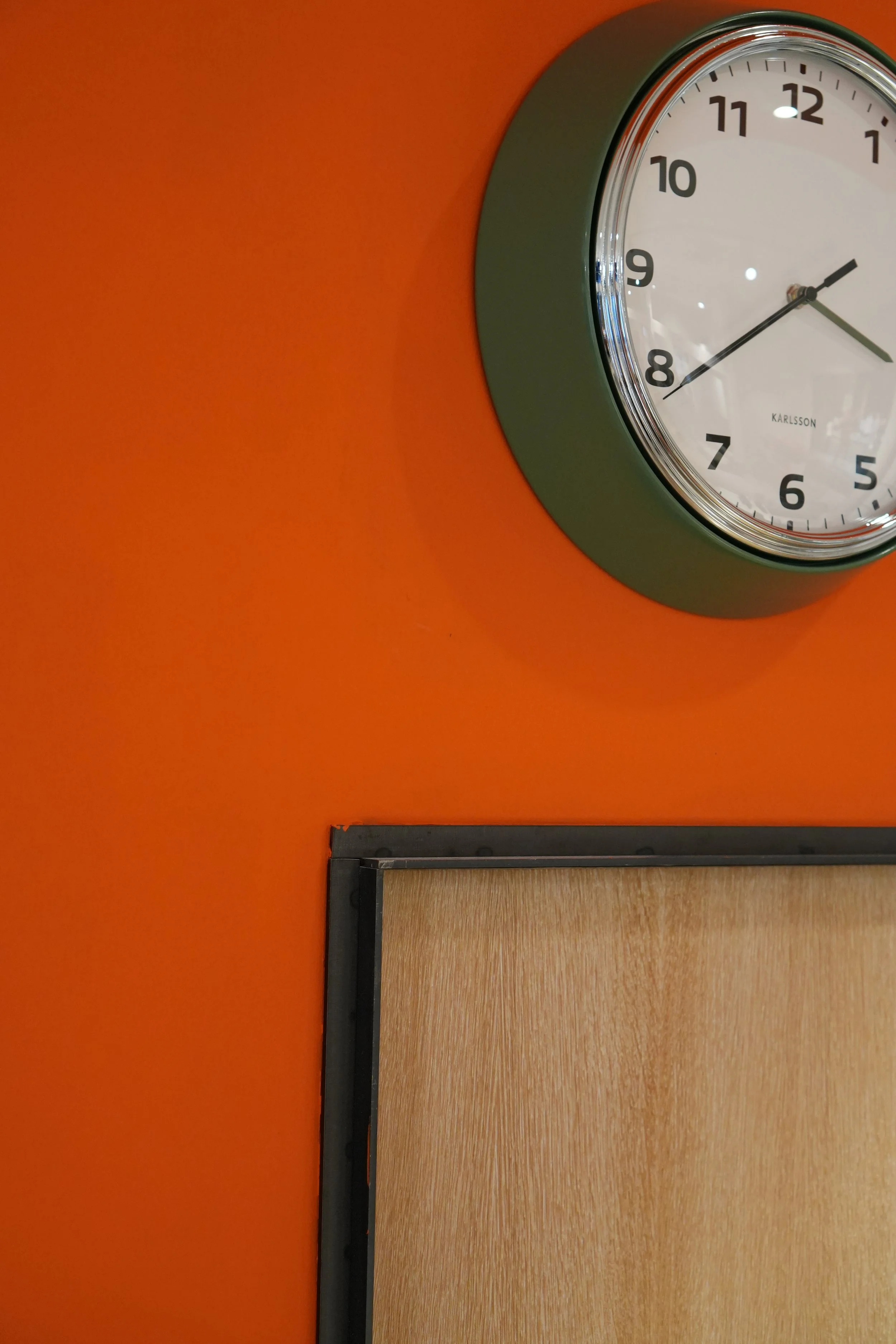 Eine Wanduhr an einer orangefarbenen Wand. Die Uhr zeigt etwa 02:13. Ein Teil eines Holzpults oder -tisches ist sichtbar im unteren Bereich.