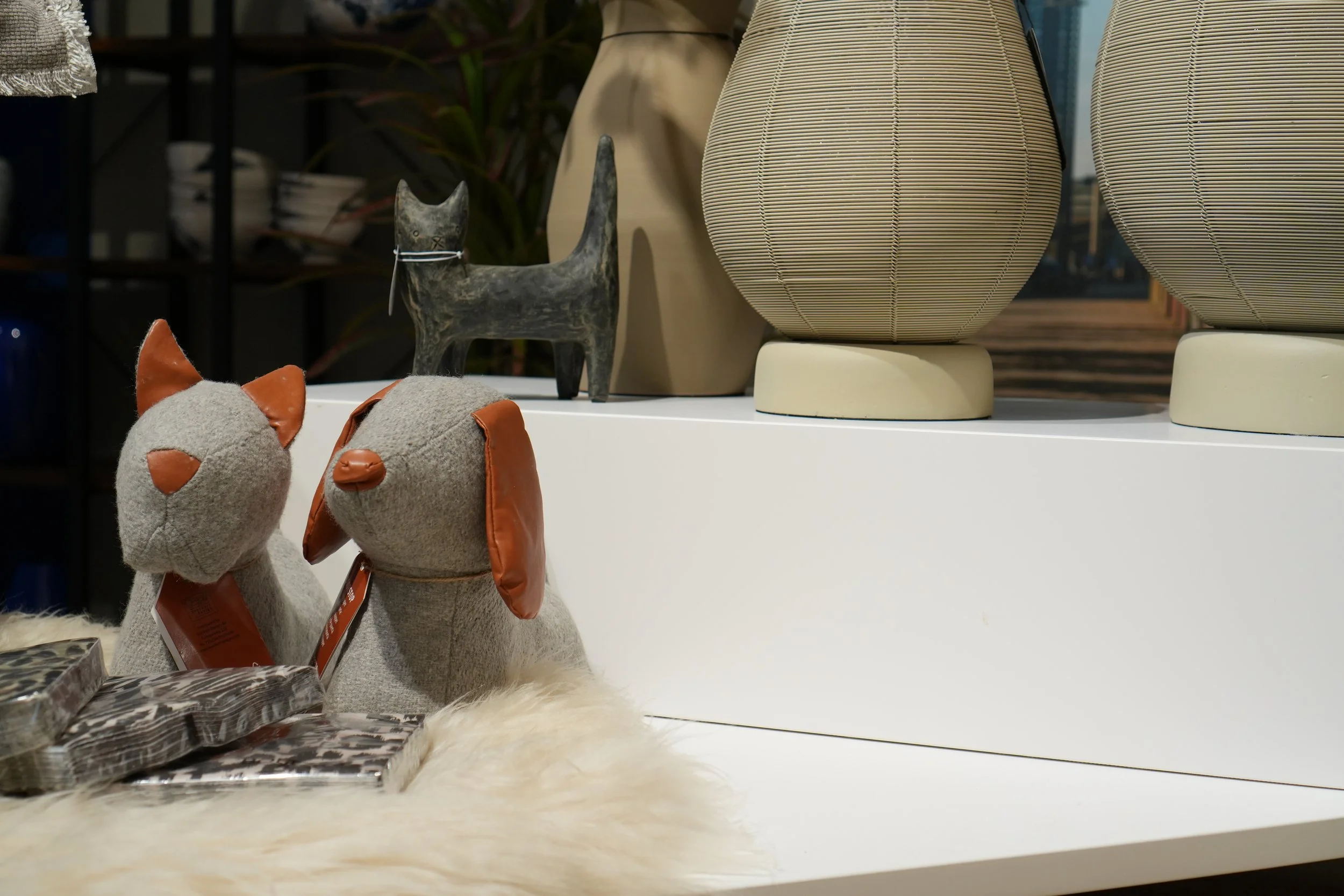 Stofftiere im Stil von Hund und Katze, dekorative Lampen, und eine Katze aus Holz auf einem weißen Tisch.