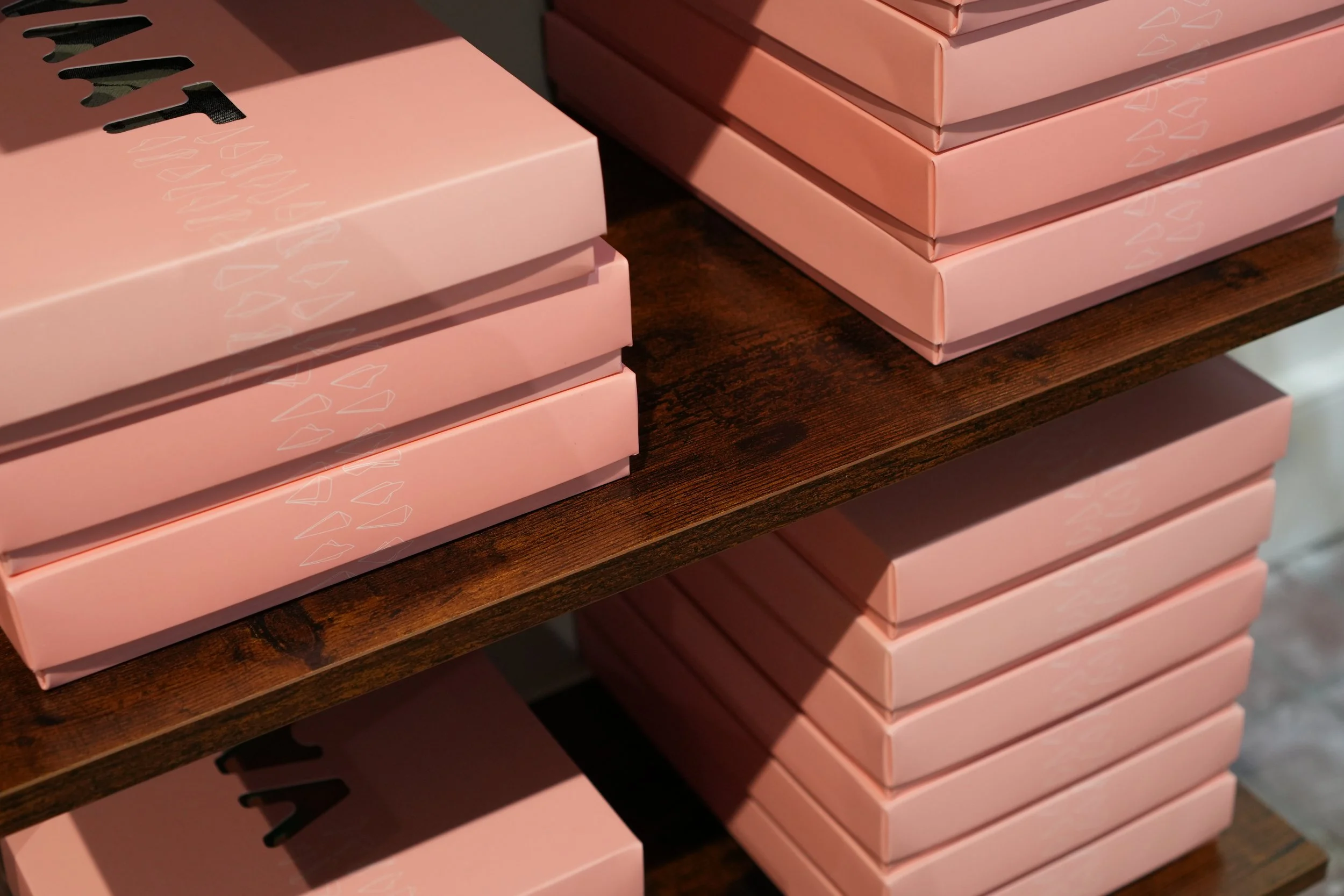 Mehrere pinke Verpackungskartons auf einem Holzregal.