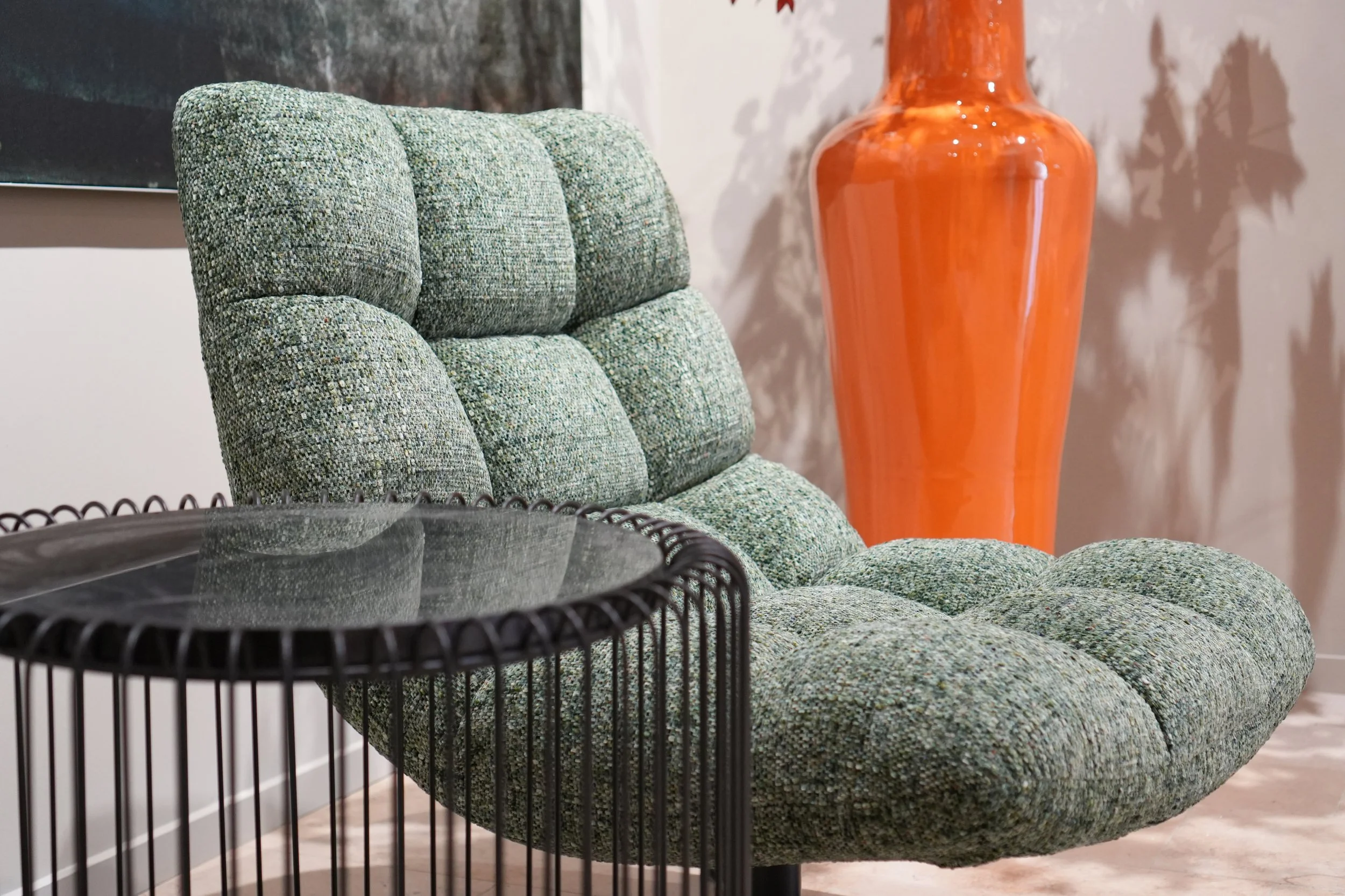 Innenansicht eines Möbelgeschäfts mit verschiedenen Stühlen, einem runden Holztisch und Stoffmustern samt anderem Dekor. Ein grüner Ledersessel steht rechts, auf einem Korb im Hintergrund liegt ein Pflanzenkübel.