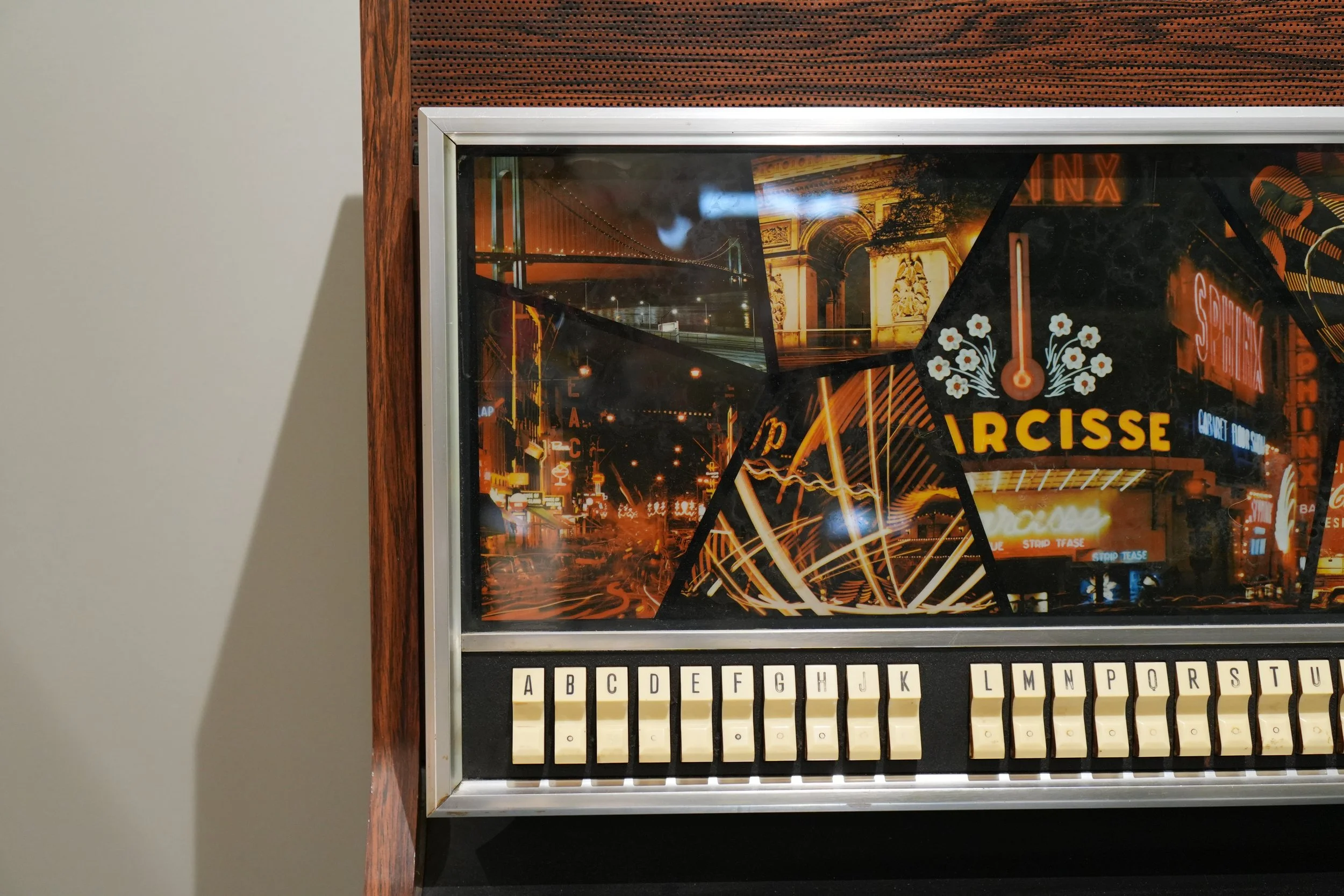 Ein Vintage Unterhaltungsautomat mit einem Stadtbild im Hintergrund, das neonbeleuchtete Schilder und eine große Attraktion namens 'Arcisse' zeigt.