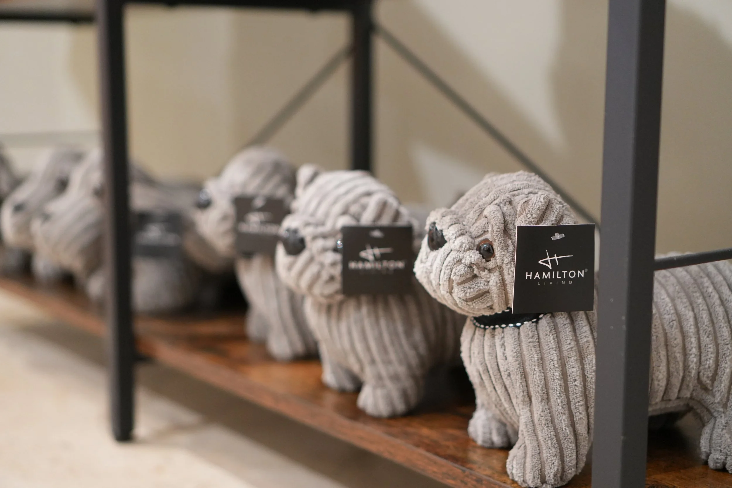 Deko-Hunde aus Stoff mit Schnauze, Ohren und Augen, die auf einem Regal stehen.